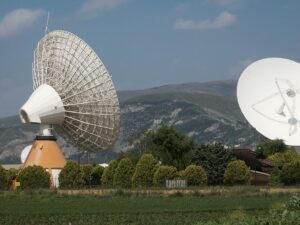 La strada passa proprio sotto le super antenne del Centro Spaziale, il più importante “teleporto” al mondo per usi civili, con 170 antenne.